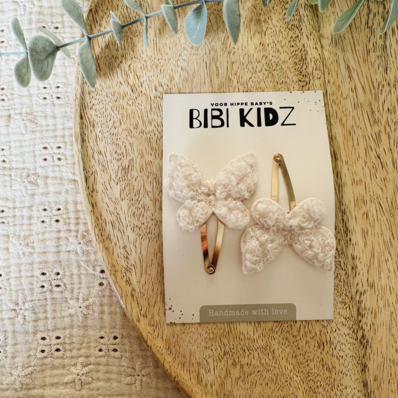Haarspeld Wollen strik NaturelSchattig haarspeldje met wollen strikje erop . Ze zitten op een klikklak speldje van 4 cm.